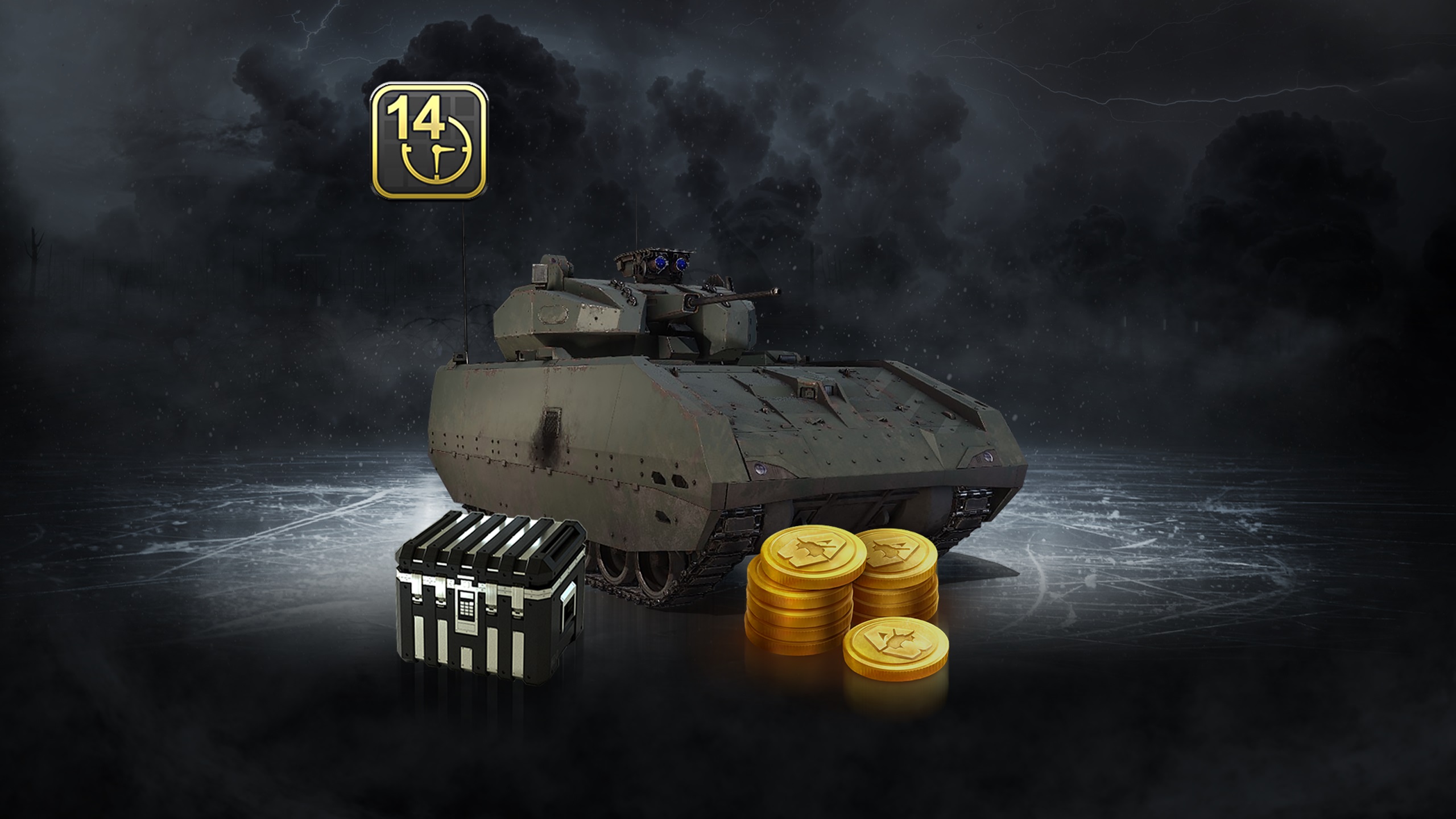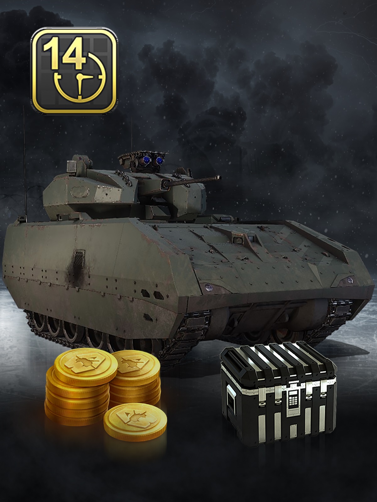 This bundle contains the Hunter AFV, 5 Platinum Loot Crates, 1.000 Gold and 14 days of Premium Time. In Armored Warfare, the Hunter AFV is a Singaporean Tier 9 Premium Armored Fighting Vehicle.