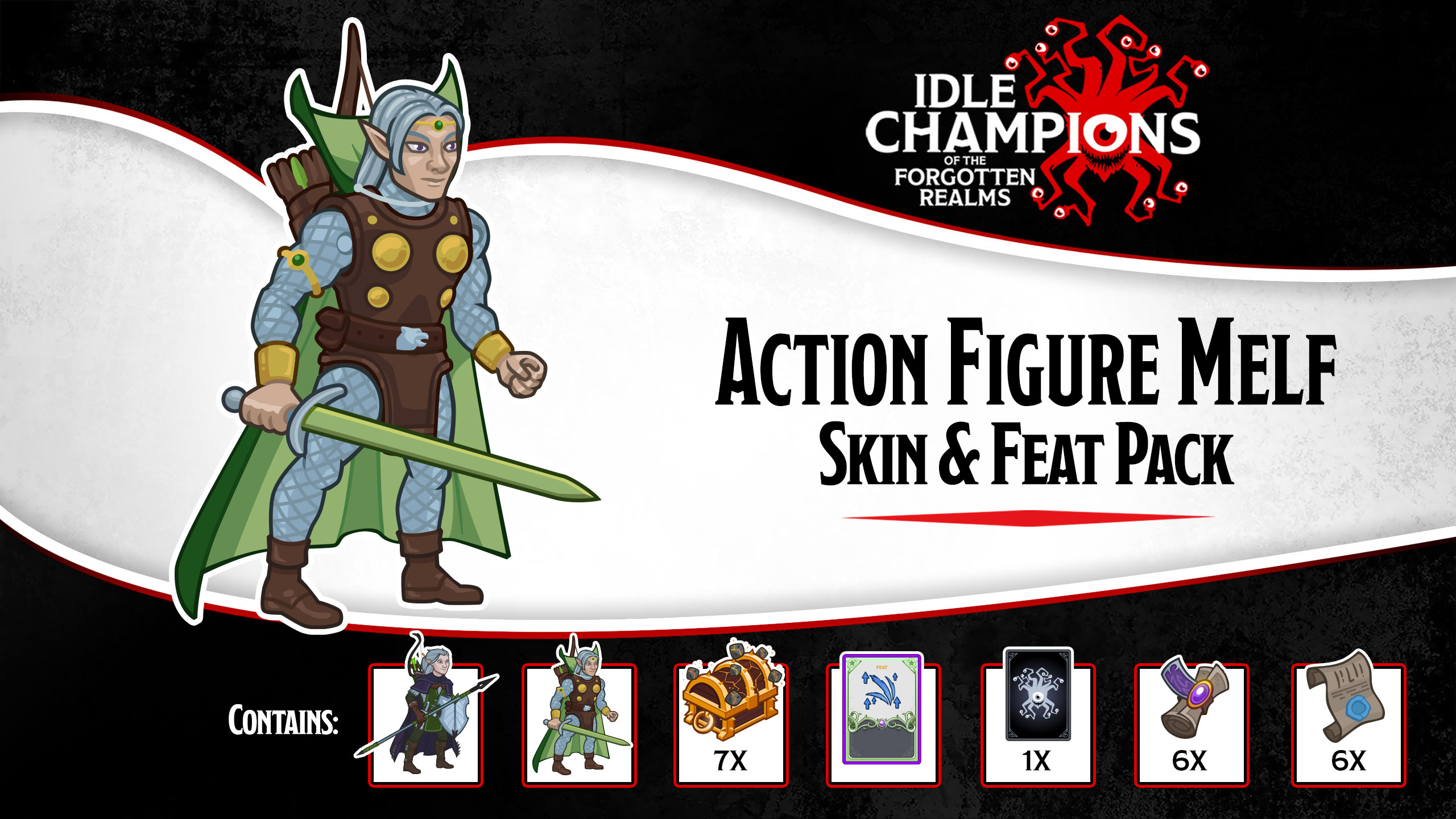This Idle Champions Skin & Feat pack contains a Champion unlock, 7 Gold Champion Chests, and an exclusive skin & feat for that Champion! Take your game to the next level!