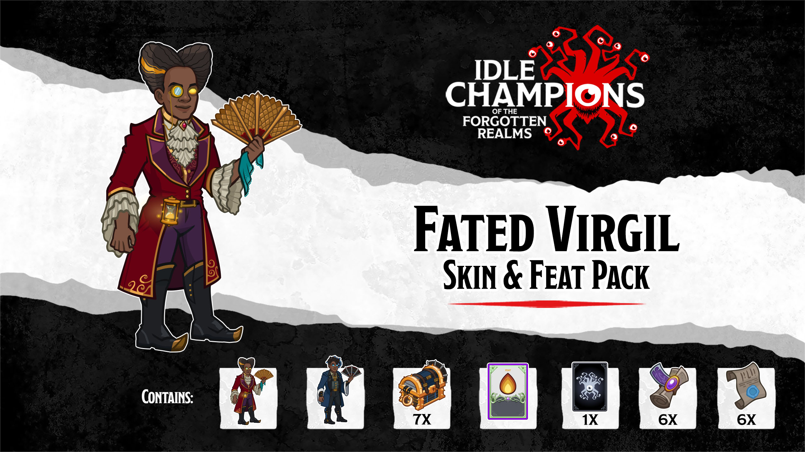 This Idle Champions Skin & Feat pack contains a Champion unlock, 7 Gold Champion Chests, and an exclusive skin & feat for that Champion! Take your game to the next level!