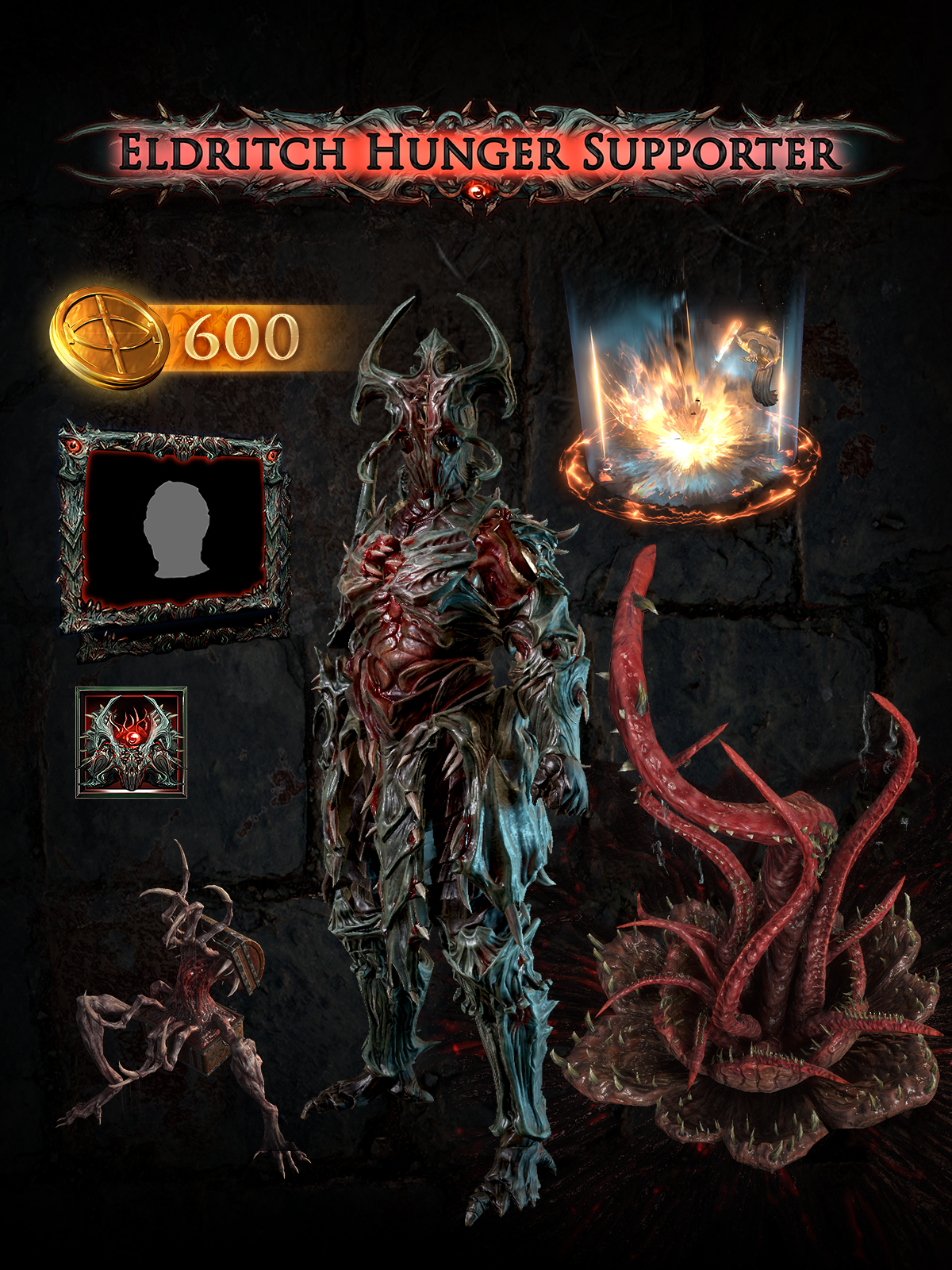 The Eldritch Hunger Supporter Pack contains an Armour Set, a Map Device, a Pet, a Finisher Effect, two Social Frames, two Forum Titles, two Badges, and 600 points.