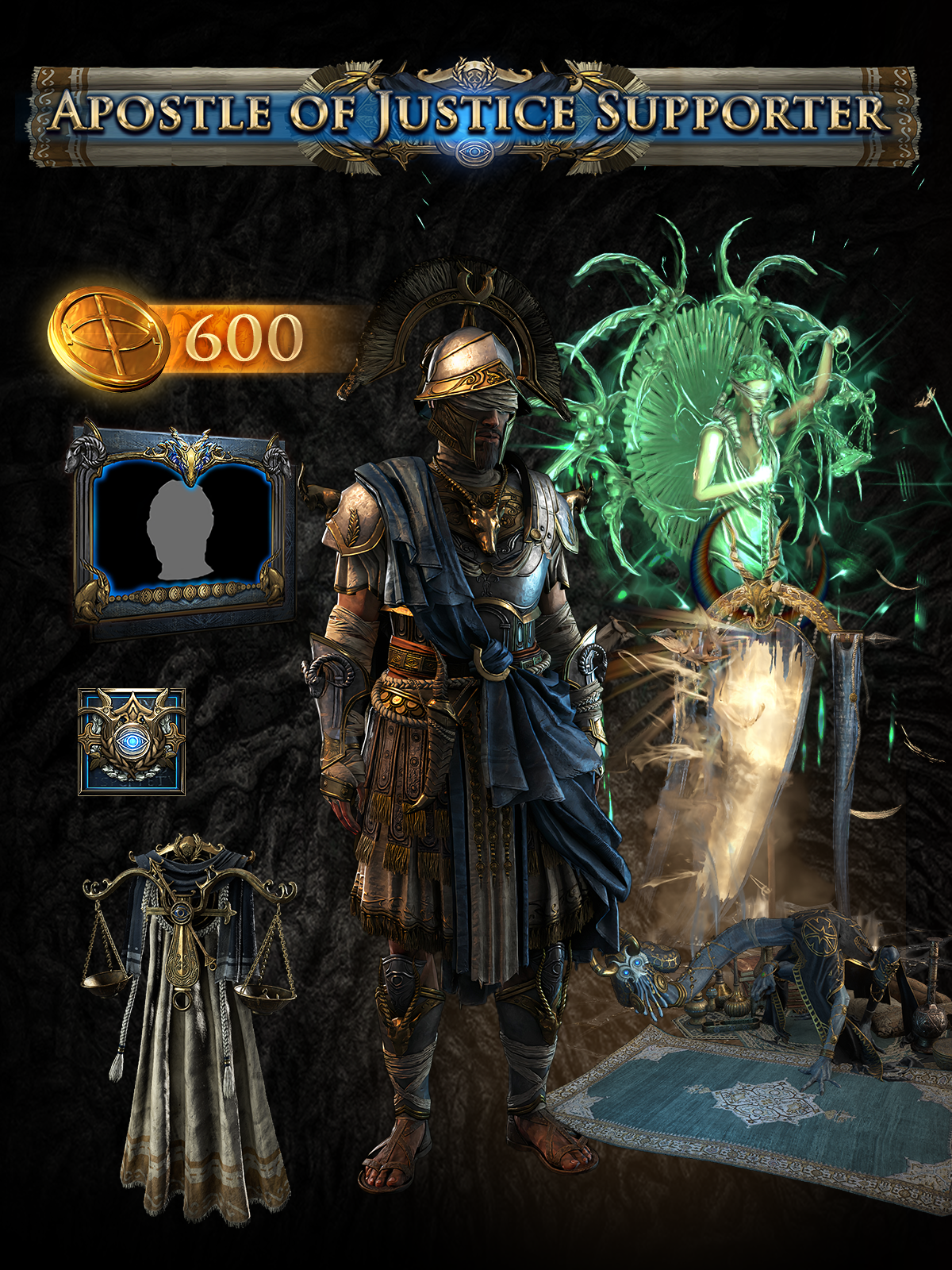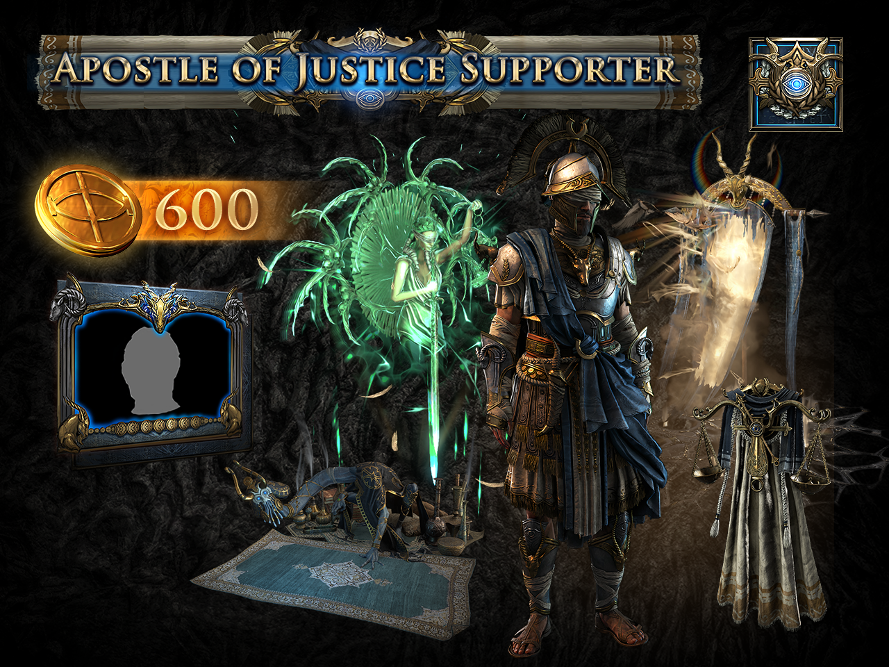The Apostle of Justice Supporter Pack contains an Armour Set, a Back Attachment, a Finisher Effect, a Portal Effect, a Hideout Decoration, two Social Frames, two Forum Titles, two Badges, and 600 points. This Supporter Pack does not provide Early Access to Path of Exile 2.