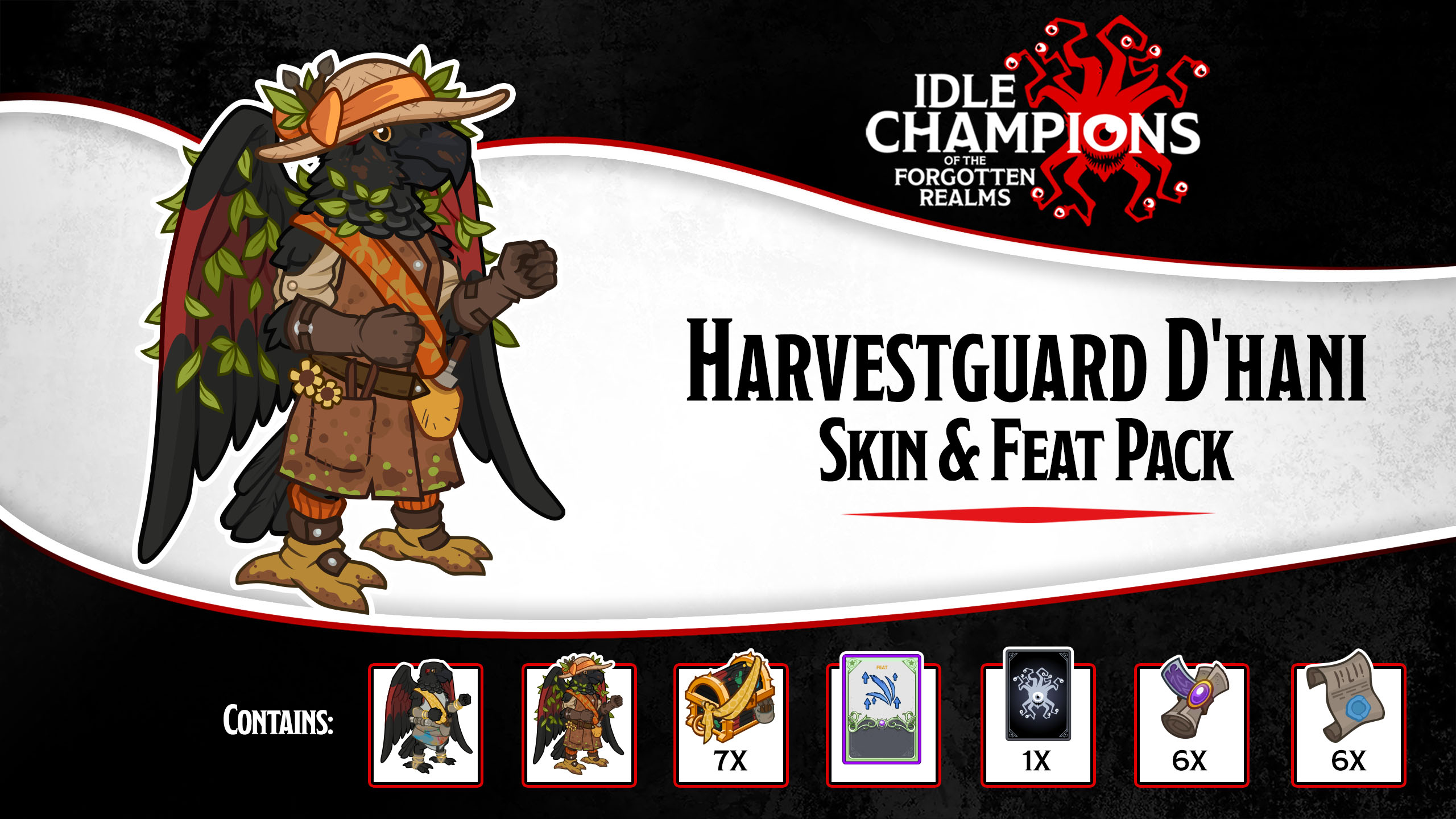 This Idle Champions Skin & Feat pack contains a Champion unlock, 7 Gold Champion Chests, and an exclusive skin & feat for that Champion! Take your game to the next level!