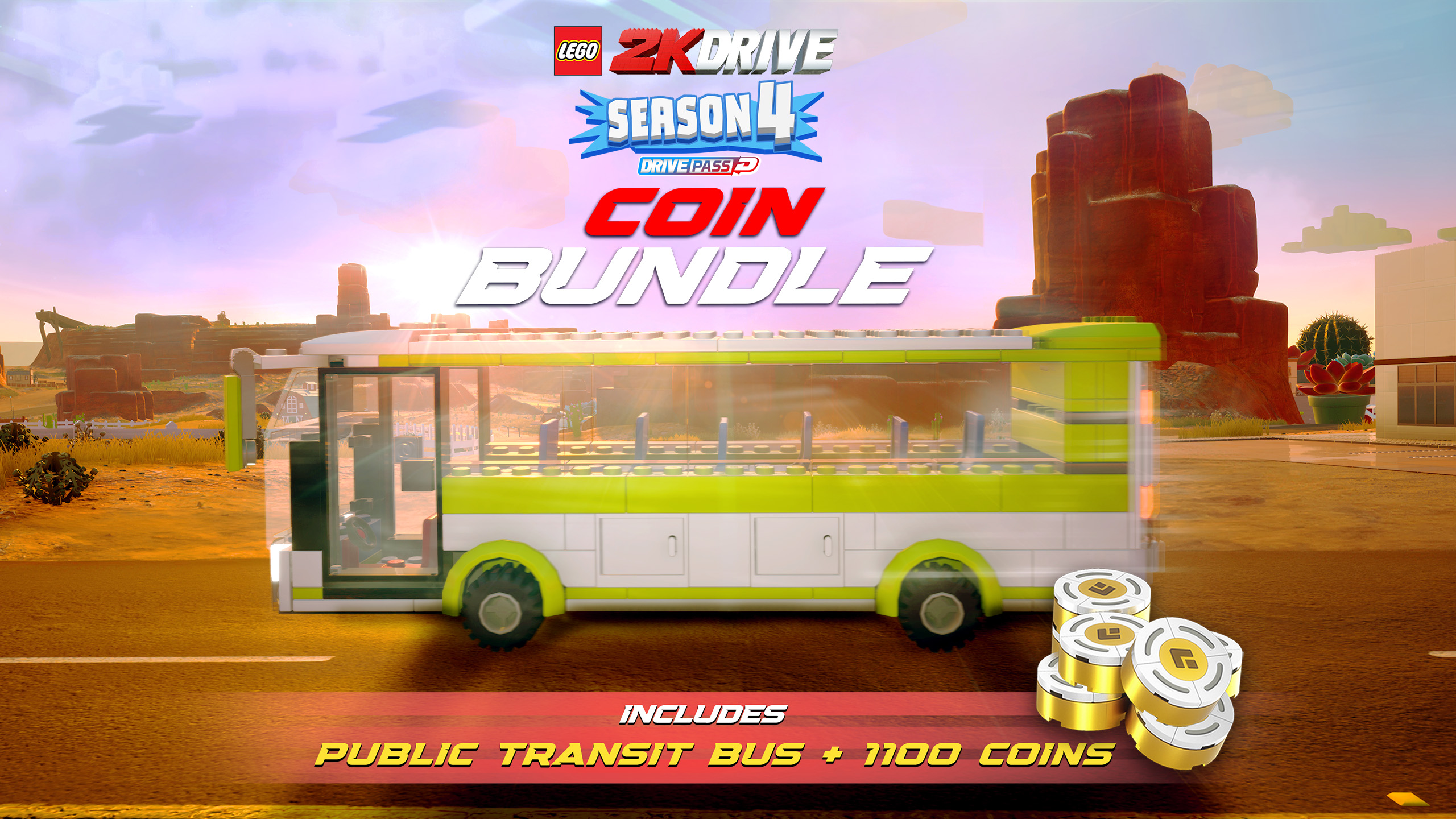 Purchase the LEGO® 2K Drive Season 4 Coin Bundle and unlock the Public Transit Bus and 1100 Coins for use in Unkie's Emporium! Use your virtual currency to buy Vehicles, Drivers, Brick Packs, Flairs, Sounds and Stickers.