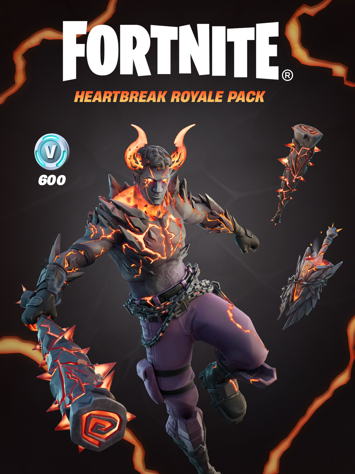 Expunge all feelings with the Heartbreak Royale Pack. Includes an Outfit, Back Bling, Pickaxe and 600 V-Bucks. V-Bucks included with this purchase can't be transferred to or used on Nintendo Switch™.