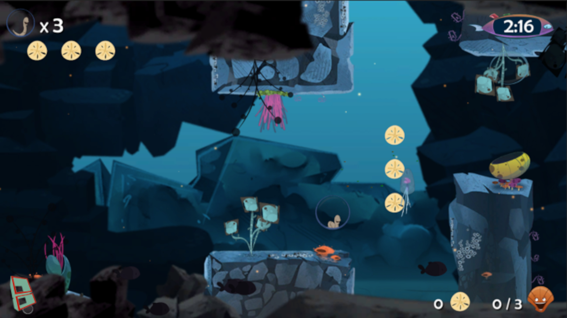 Travel the underwater dangers of the reef in a breathable air bubble. Test your reflexes as you avoid obstacles and carefully explore each stage to grab items essential for clearing each level.