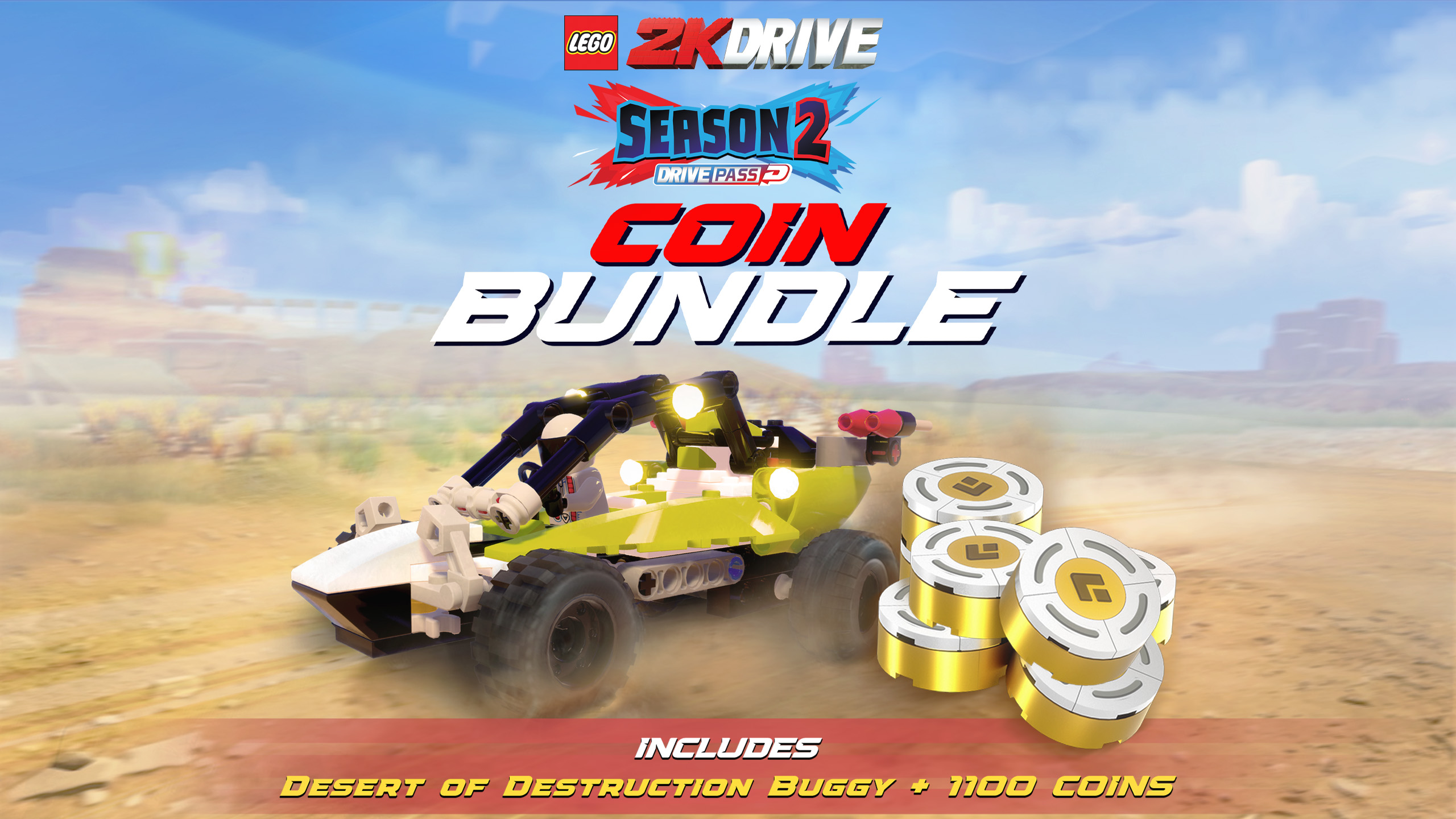 Purchase the LEGO® 2K Drive Season 2 Coin Bundle and unlock the Desert of Destruction Buggy and 1100 Coins for use in Unkie's Emporium! Use your virtual currency to buy Vehicles, Drivers, Brick Packs, Flairs, Sounds and Stickers.