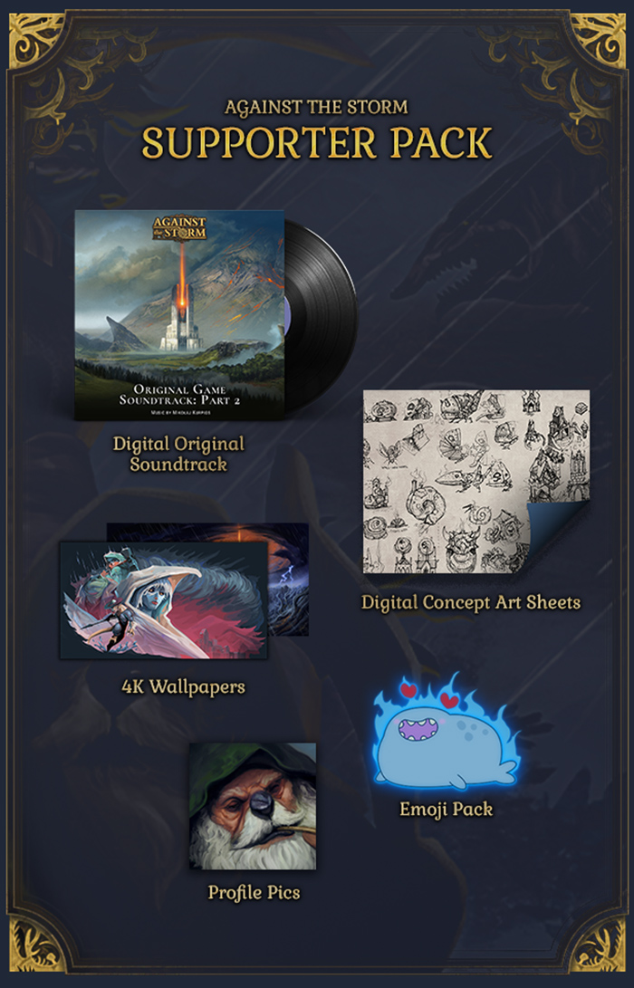 The Against the Storm Supporter Pack features the official Against the Storm soundtrack as well as 4k wallpapers, emoji packs, and a look behind the scenes with a 300+ page digital artbook and more.