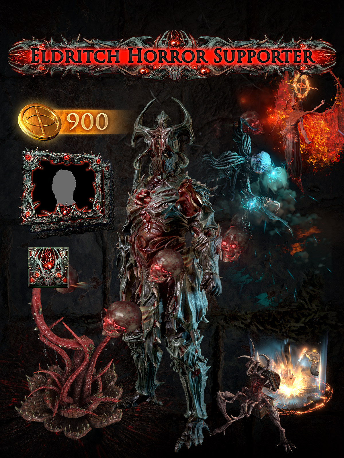 The Eldritch Horror Supporter Pack contains an Apparition Effect, a Character Effect, an Armour Set, a Map Device, a Pet, a Finisher Effect, three Social Frames, three Forum Titles, three Badges, and 900 points.