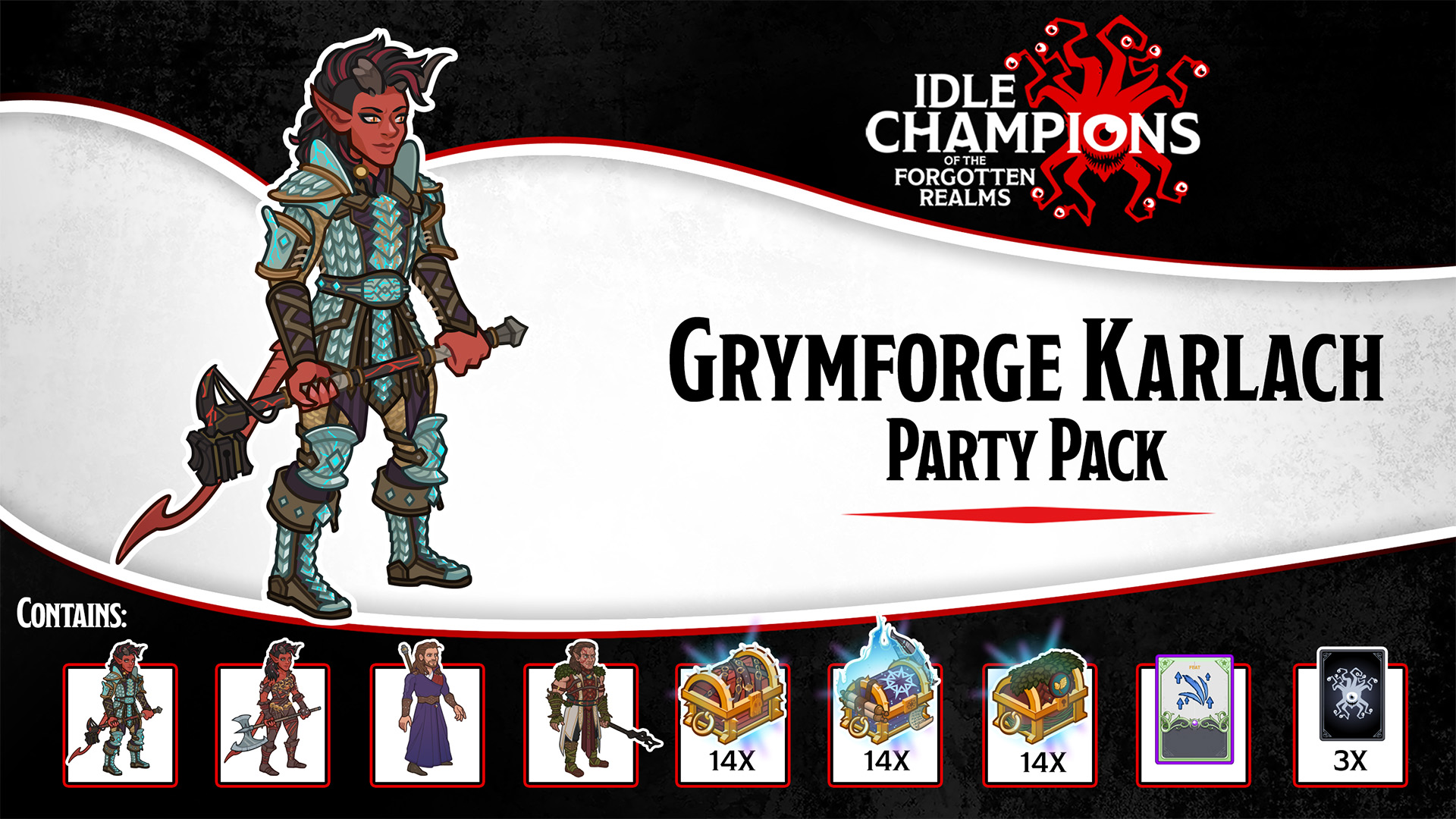 This pack unlocks 3 of the Baldur's Gate 3 Champions in Idle Champions: Karlach, Gale, and Halsin. Also included are 14 Platinum Champion Chests for each, and an exclusive Skin & Feat for Karlach! Take your game to the next level with this Party Pack!