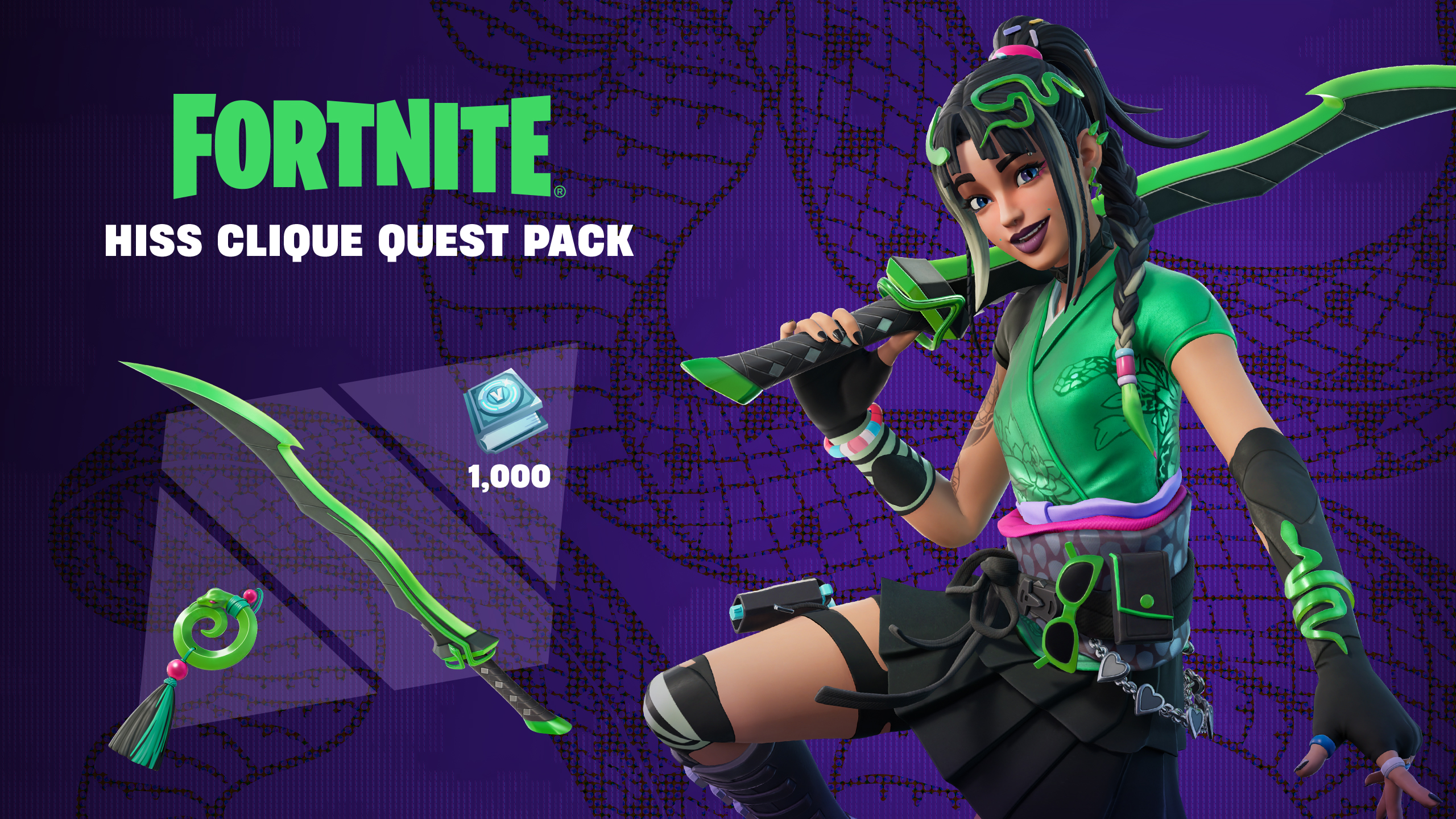 Poised, coiled and ready to strike. Complete Quests to earn V-Bucks with the Hiss Clique Quest Pack. Includes 1 Outfit, 1 Back Bling, 1 Pickaxe, and Quests to earn up to 1,000 V-Bucks.